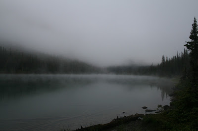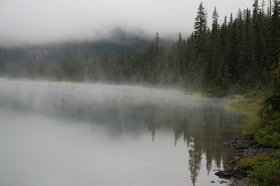 With our backpacks mostly loaded (aside from the food bags which were on the bear cables) we trudged over to the cooking area to make a coffee and eat some breakfast. The clouds were quite low, and the mist on the lake looked spectacular.