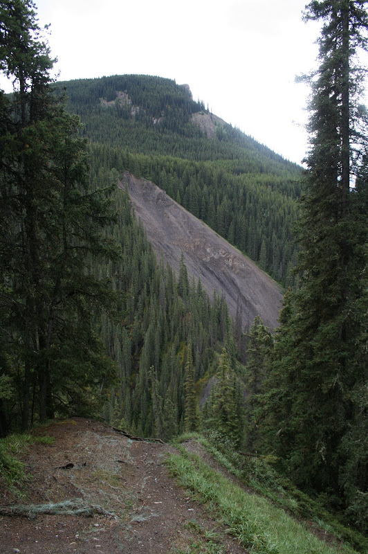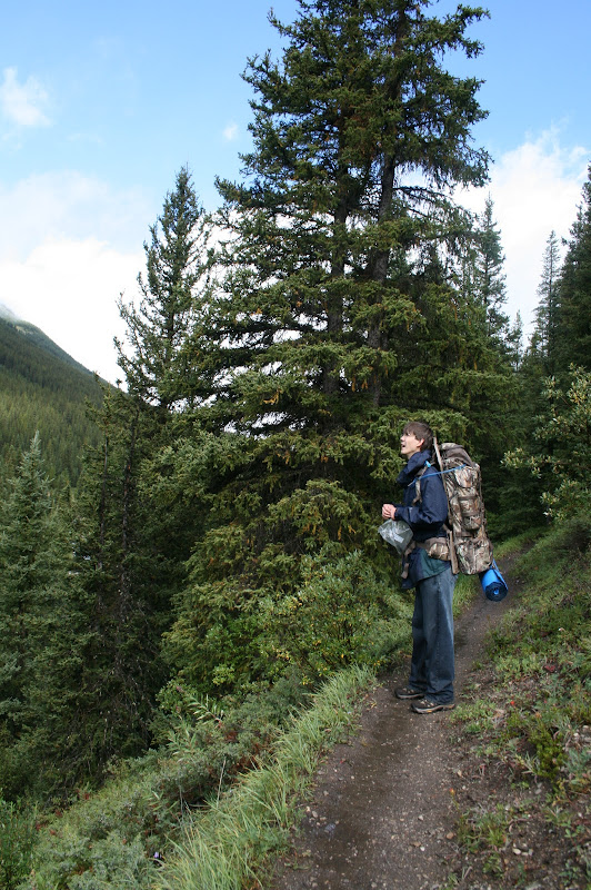 Not long after we passed the grouse, I heard something to the left of the trail, making quite the racket. After a moment of searching the forest, which was not particularly dense, I spotted something climbing a tree. Initially I thought it might be a porcupine, but it was rather large. A longer look resulted in the discovery that it was, in fact, a grizzly bear. We must have startled it, because it shimmied up the tree, decided that it still didn’t feel particularly safe, scooted down the tree, and ran for it’s life. It was still a cub, likely born sometime in March, and still under the care of it’s mother, so we didn’t bother to linger very long. Neither of has opted to carry bear spray, and I didn’t fancy having an encounter with his parental unit.