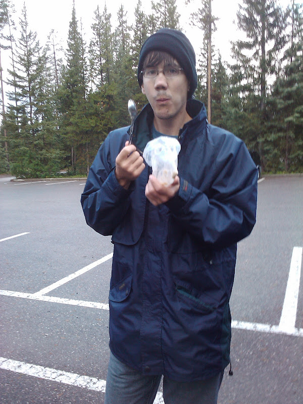 We selected a spot and settled in for a rather chilly lunch. We boiled water and ate freeze-dried hiking rations, followed by hot chocolate and changing our socks, which had been soaked through for some time. It was cold and we were both tired and damp, but Mike was determined to make it to Lake Luellen and who was I to argue? We broke camp around 1 pm and hit the trail.